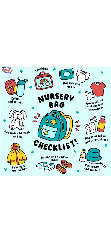 Other useful items could include - spare clothes/ underwear, a coat for cold weather, hat and gloves, sunhat and cream of factor 50+, wellies for wet weather, an all-in-one covering to protect clothes (We aim to go out in all weathers), lots of spare pants and socks for toilet training along with a pair of wipeable shoes, their own cupfor their water, and their comfort (especially if they have a sleep). All items need to be labelled with your child's name, just in case they mix their things up with another child.